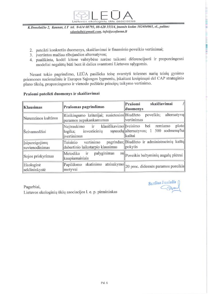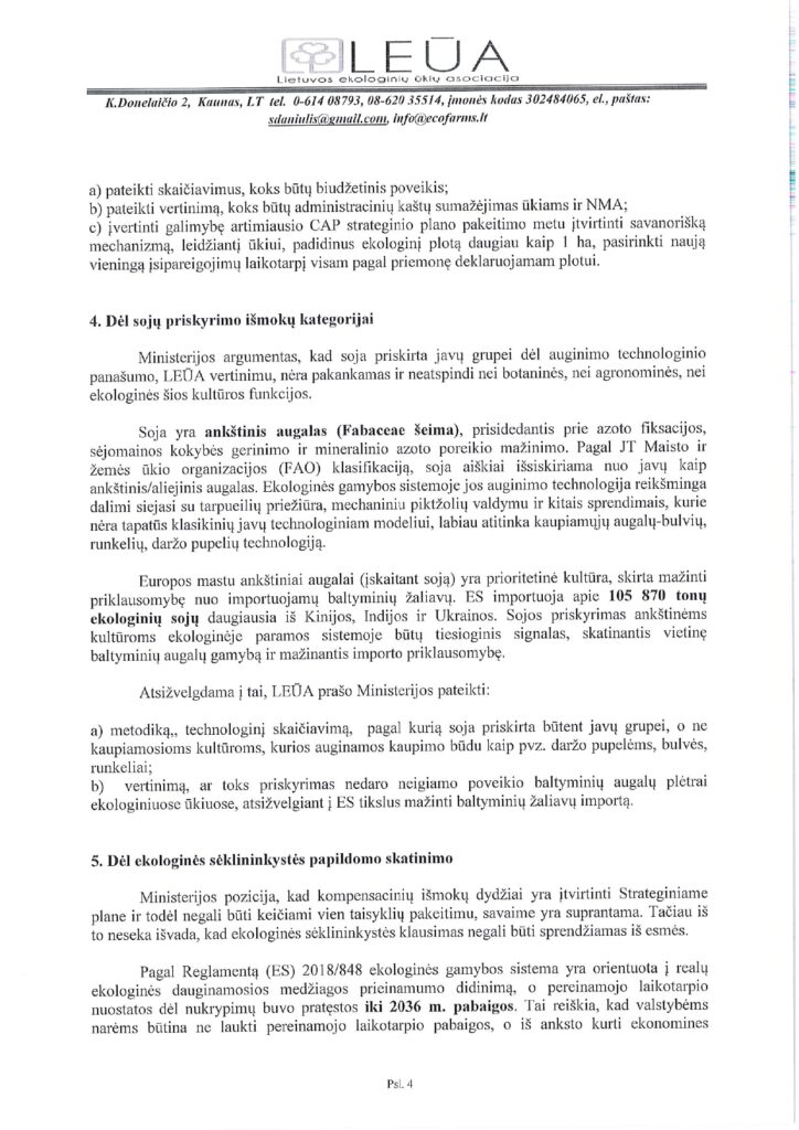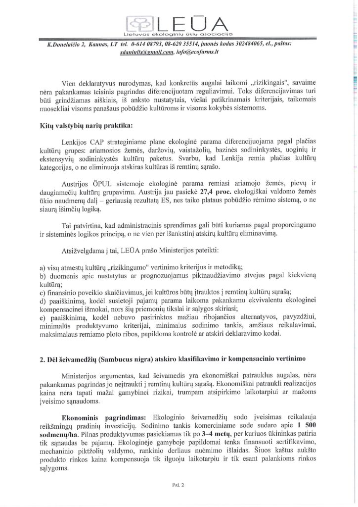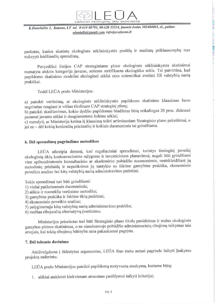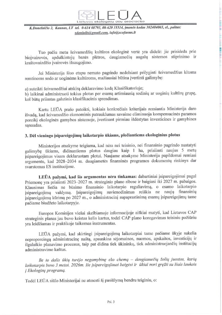 Lietuvos ekologinių ūkių asociacija išnagrinėjo LR Žemės ūkio ministerijos poziciją dėl KPP 2023-2027 m. intervencinės priemonės „Ekologinis ūkininkavimas. Ekologinio ūkininkavimo tęstiniai įsipareigojimai” įgyvendinimo taisyklių pakeitimo projekto. Asociacijos manymu, ministerijos pateiktas atsakymas kelia abejonių, kad kad siūlomas reguliavimas atitinka lygiateisiškumo, proporcingumo, skaidrumo ir gero administravimo principus. Pateikiame LEŪA atsakymą ministerijai.
